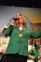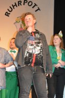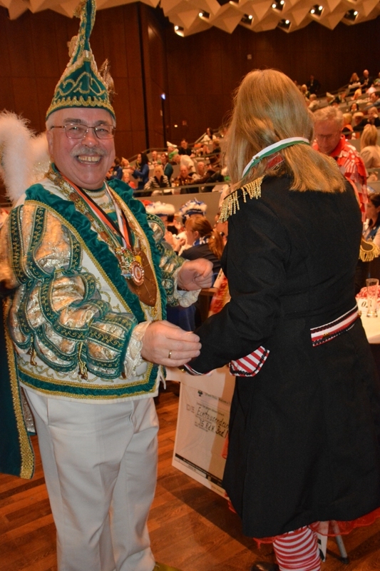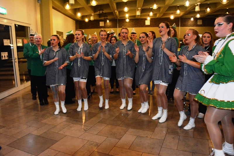 Beim Showtanz der Gruen-Weiss Funken tanzten die in fescher Bergmannsausrüstung eine Hommage an das Ruhrgebiet und die Stadt Duisburg. Bei der Musik fehlte weder das Steigerlied noch die Hymne des MSV oder der Schlager „Ihr seid das Ruhrgebiet“ von Wolle Petry. Diese Darbietung passte hervorragend zum sehr gelungenen Bühnenbild der Gruen-Weissen, das ebenfalls die Heimatstadt Duisburg in den Mittelpunkt stellte. Sogar ein Stahlabstich wurde perfekt in Szene gesetzt. Kein Wunder, dass auch der Funke im Publikum schon früh übersprang und sich diese Begeisterung die ganze Sitzung hielt. Großartige Leistungen wie dem Showtanz der Red Diamonds oder der sehr gelungenen Performance der Klamauktruppe „Die Kellergeister“ wechselten sich mit äußerst witzigen Büttenreden von Udo Winnekendonk und Franz-Josef Bienentreu ab oder wurden durch schwungvolle Gesangseinlagen veredelt. Michael Leuthen, das Schlager-Duo Easy Living oder die über alle Grenzen hinaus bekannten Coloured Birds hielten die Stimmung permanent hoch.