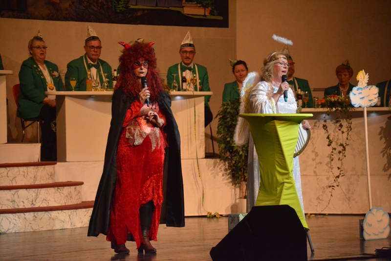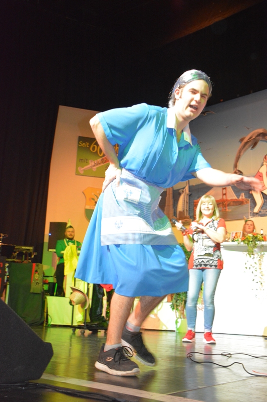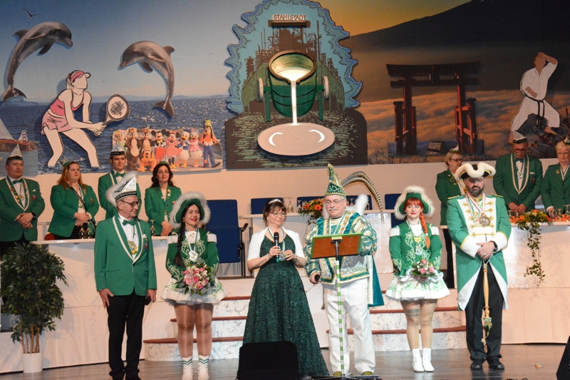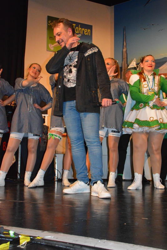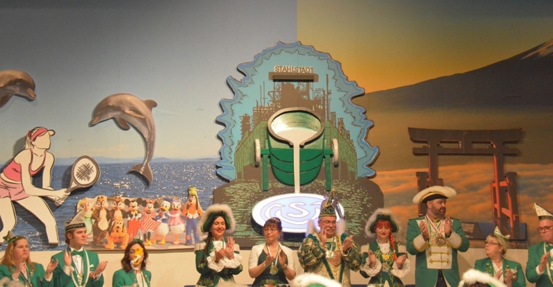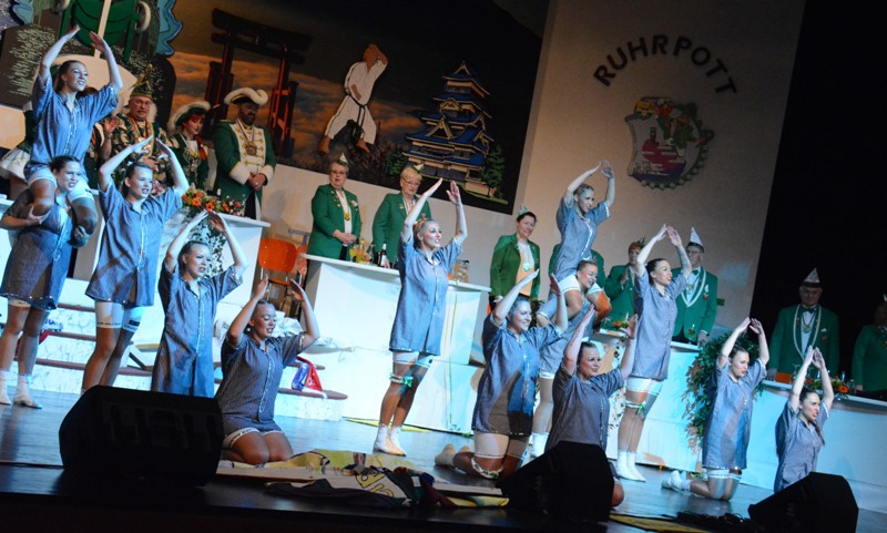 Beim Showtanz der Gruen-Weiss Funken tanzten die in fescher Bergmannsausrüstung eine Hommage an das Ruhrgebiet und die Stadt Duisburg. Bei der Musik fehlte weder das Steigerlied noch die Hymne des MSV oder der Schlager „Ihr seid das Ruhrgebiet“ von Wolle Petry. Diese Darbietung passte hervorragend zum sehr gelungenen Bühnenbild der Gruen-Weissen, das ebenfalls die Heimatstadt Duisburg in den Mittelpunkt stellte. Sogar ein Stahlabstich wurde perfekt in Szene gesetzt. Kein Wunder, dass auch der Funke im Publikum schon früh übersprang und sich diese Begeisterung die ganze Sitzung hielt. Großartige Leistungen wie dem Showtanz der Red Diamonds oder der sehr gelungenen Performance der Klamauktruppe „Die Kellergeister“ wechselten sich mit äußerst witzigen Büttenreden von Udo Winnekendonk und Franz-Josef Bienentreu ab oder wurden durch schwungvolle Gesangseinlagen veredelt. Michael Leuthen, das Schlager-Duo Easy Living oder die über alle Grenzen hinaus bekannten Coloured Birds hielten die Stimmung permanent hoch.