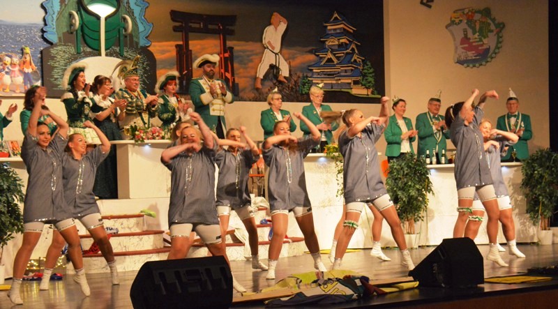 Mittlerweile vier Generationen stehen in dieser Session beim Einmarsch der Aktiven der Karnevalsgesellschaft Gruen-Weiss Walsum e.V. auf der Bühne. Im Damen- und Herrenelferrat stehen rüstige 80jährige neben jungen Menschen, die ihre Enkelkinder sein könnten und gleichzeitig tanzen die Urenkelchen in der jüngsten Tanzgarde des Vereins.