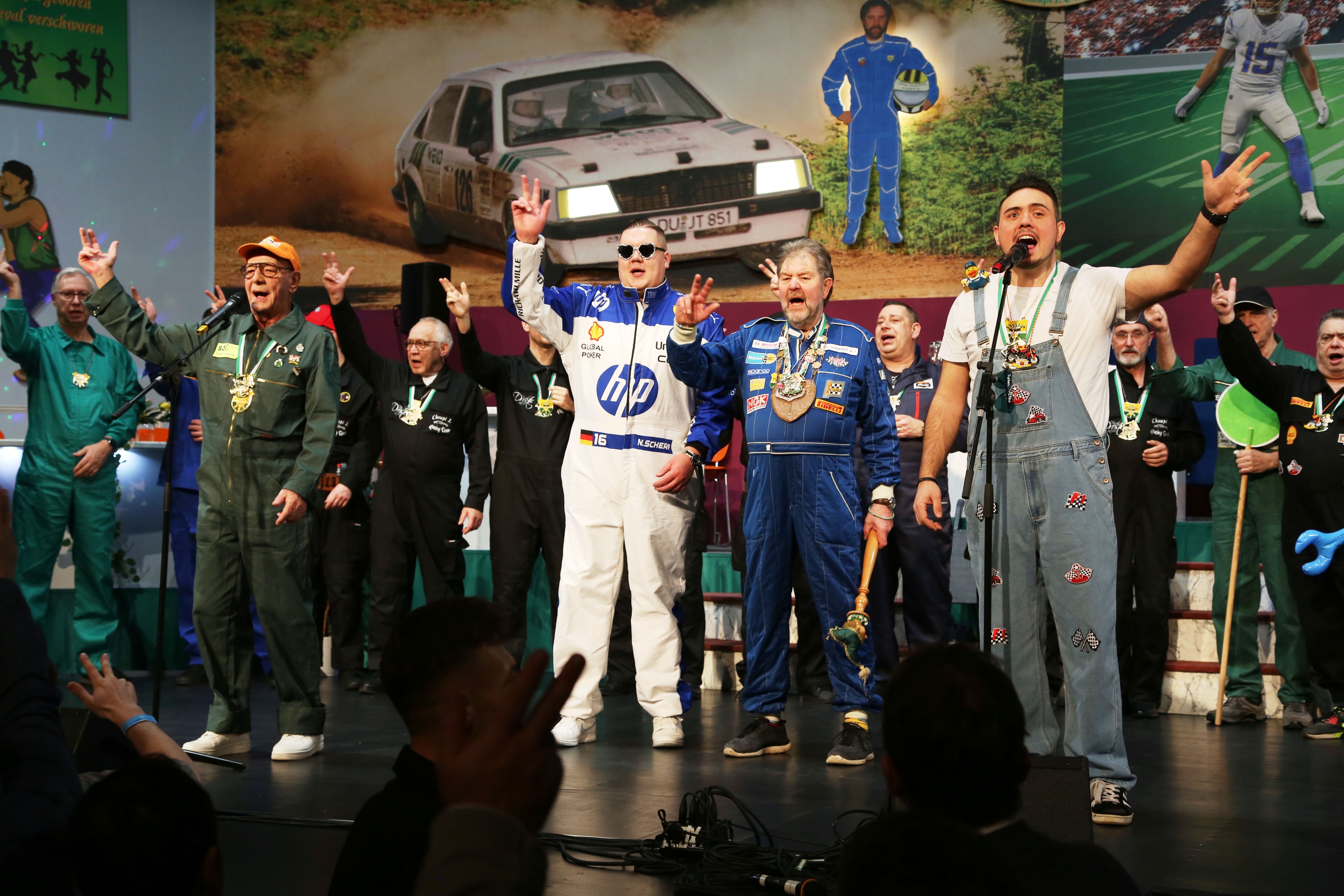 Prinz Choupi I. heizte allen im Saal von Beginn an ein, in Rennoutfit und unterstützt von einem Rennfahrerteam und Monteuren, die auf dieses Rennen hingefiebert hatten.