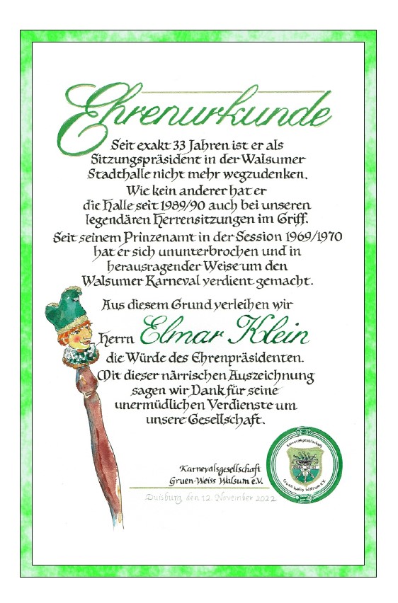 Unseren Dank und unsere Anerkennung bringen wir mit der grafisch sehr gelungenen Ehrenurkunde zum Ausdruck. Mit dieser närrischen Auszeichnung sagen wir Dank für seine unermüdlichen Verdienste um unsere Gesellschaft.